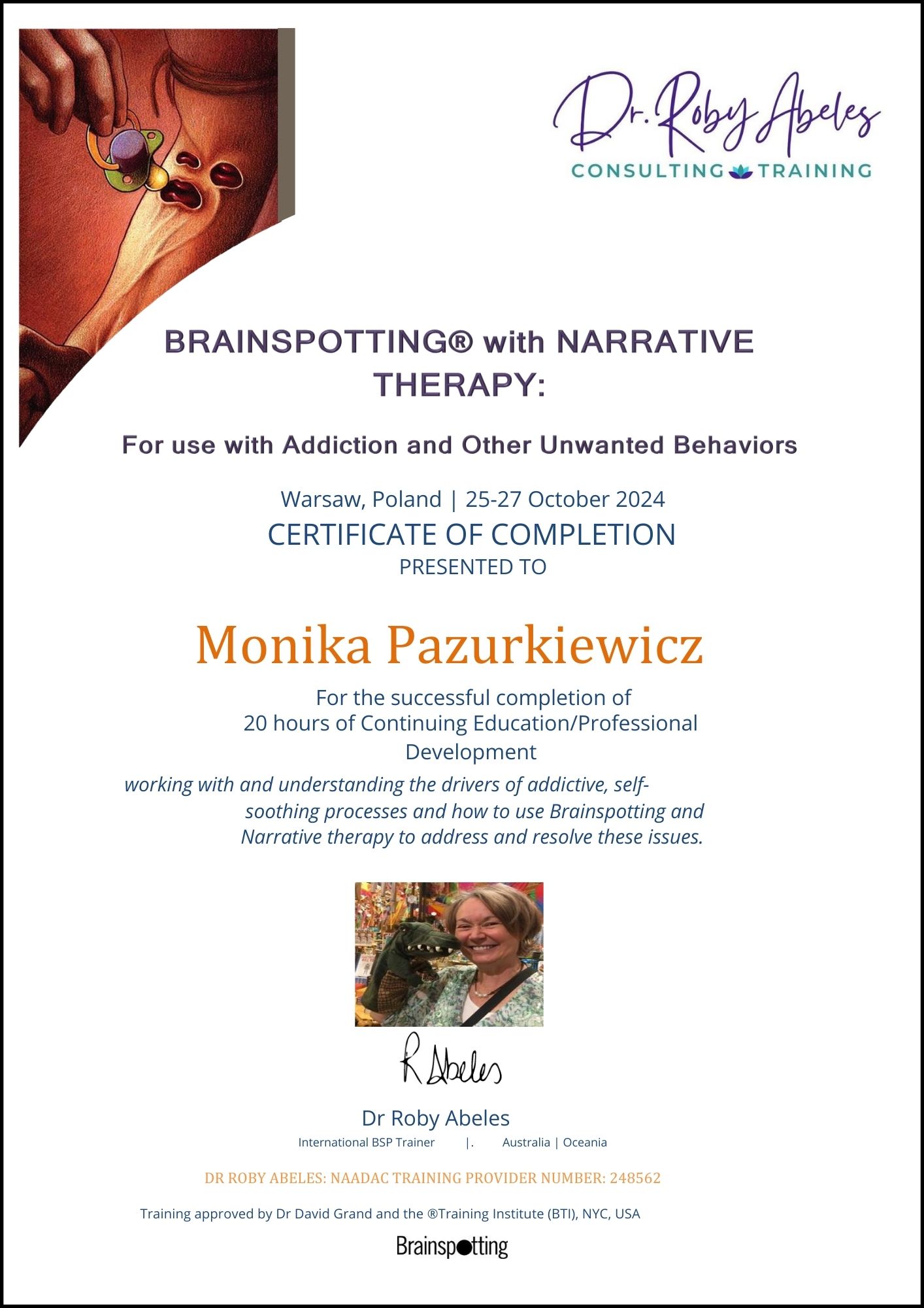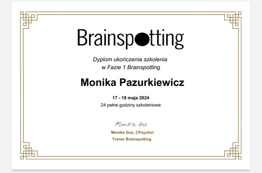 To metoda oparta na uważności, pracy z ciałem i relacji terapeutycznej. Podczas sesji znajdujemy pozycję oczu, która prowadzi nas do źródeł traumy. Utrzymując wzrok w jednym punkcie możemy uzyskać dostęp do energii uwięzionej w naszej nieświadomości. Brainspotting umożliwia przetworzenie i uwolnienie pamięci o trudnych doświadczeniach. Oddziałuje bezpośrednio na system nerwowy. To podejście terapeutyczne pomocne w pracy z traumą, lękiem, depresją, chronicznym bólem wywołanym stresem i szerszym spektrum dyskomfortu psychicznego. Dla mnie szczególnie ważne w procesie Brainspotting jest zaangażowanie ciała, jego doznań i odczuć – świadomość somatyczna. Skupiona, głęboka uważność. Dostrojenie i podążanie za klientem ku naturalnej zdolności naszego mózgu do samoleczenia i homeostazy.